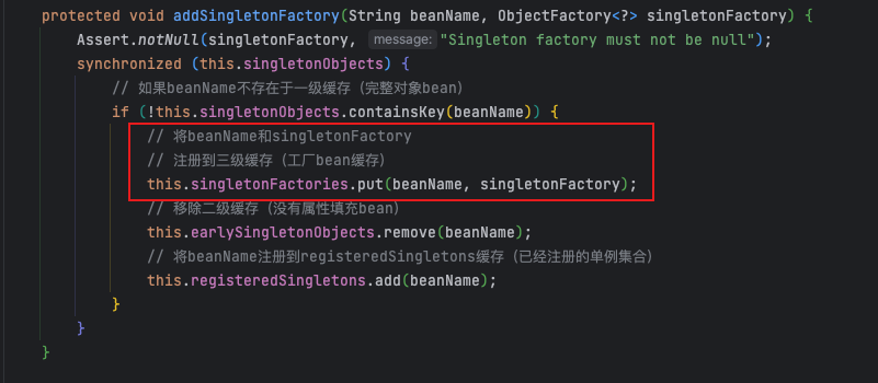 在完成Bean的实例化后,属性注入之前Spring将Bean包装成一个工厂对象添加进了三级缓存中,对应源码如下: