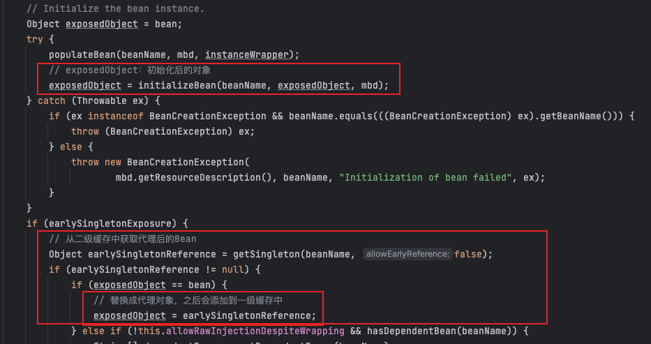 }getEarlyBeanReferenceAOP的情况下,上面的代码等价于:protected Object getEarlyBeanReference(String beanName, RootBeanDefinition mbd, Object bean) {