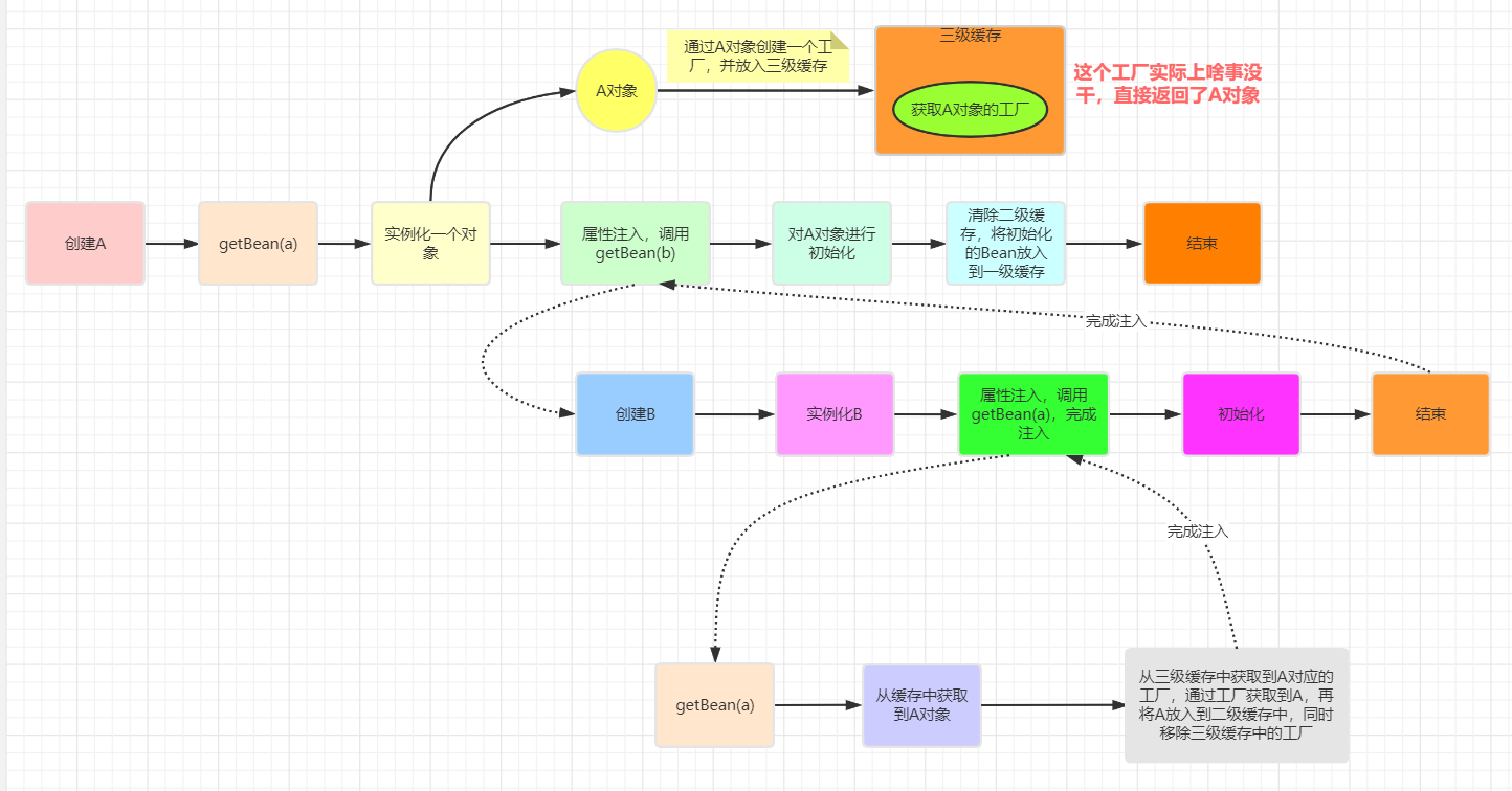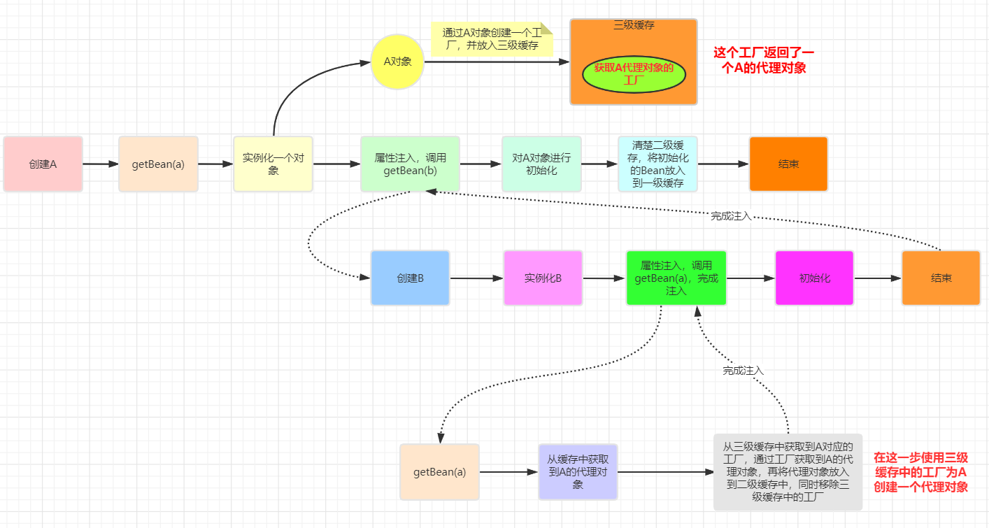 }循环依赖,那没有办法,只有给Bean先创建代理最后一步完成代理而不是在实例化后就立马完成代理没有循环依赖,只是三级缓存添加了一个代理A对象工厂(不会执行),A对象会在初始化最后一步生成代理对象,然后放入一级缓存,最后清空二三级缓存Spring是如何解决的循环依赖?