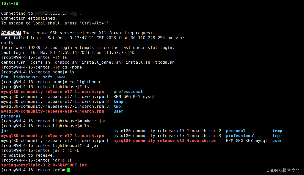 scp target/spring-petclinic.jar user@your_server_ip:/path/on/server确保替换 user 为服务器用户名,your_server_ip 为服务器IP地址,/path/on/server 为服务器上的存储路径。