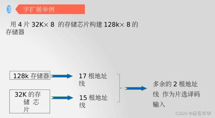 以这题目为例子,用32K x 8到128K x 8,然后32K->128K,215->217,增加了两位,所以上图的A16-15才会指向上面,这两位就是新增给编译器的,就是编译器中的2的来源,然后这4就是扩展了4倍,