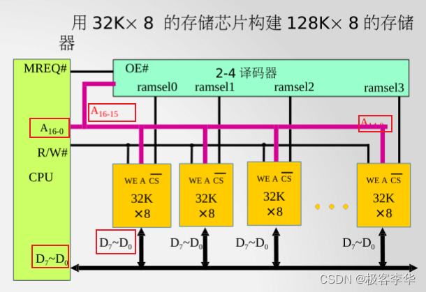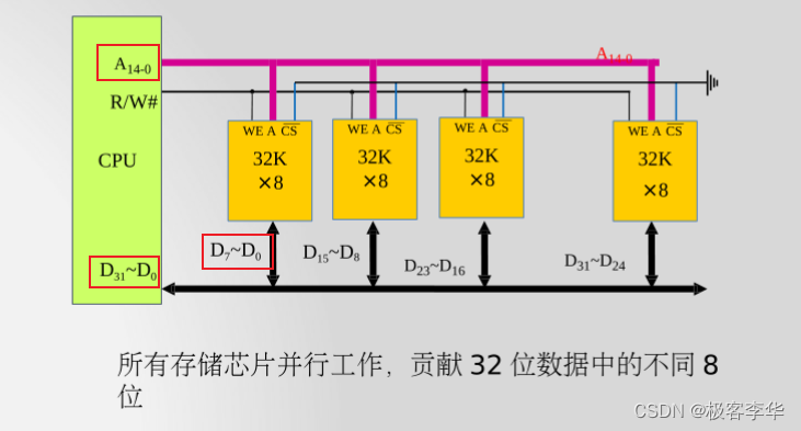 对于32k= 215,所以上面的A的下标就是14~0(下标从0开始),因为是32K,然后4片,所以每一片分配8位,于是对于D有,第一片,D7~D0。
