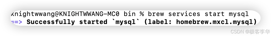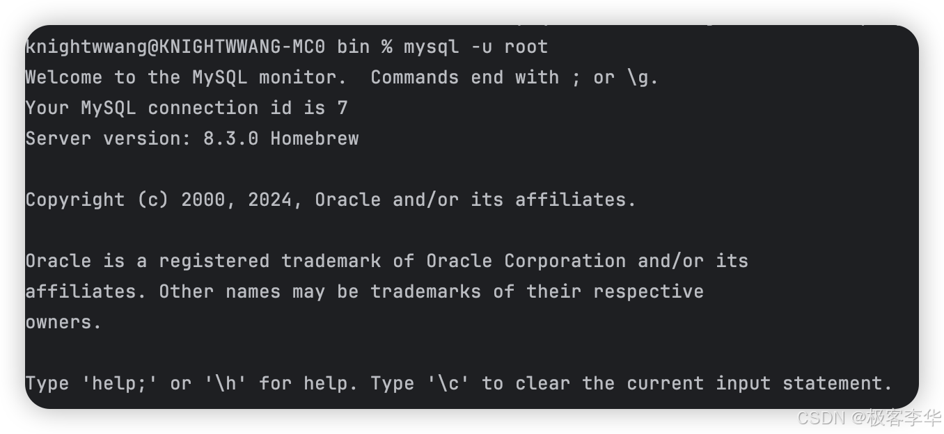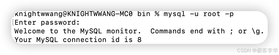 连接到MySQL: 在另一个终端窗口中,使用以下命令连接到MySQL服务器: