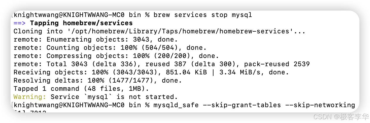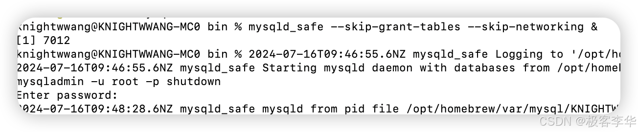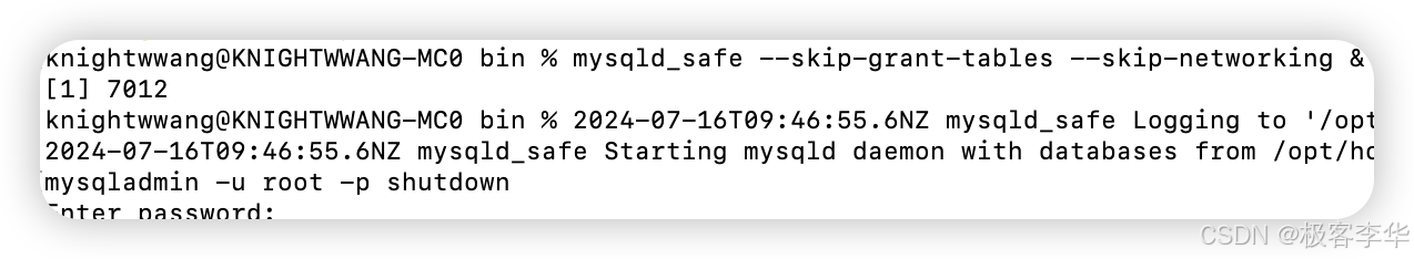 mysqladmin -u root -p shutdown当提示输入密码时,由于是在安全模式下,你不需要输入密码。