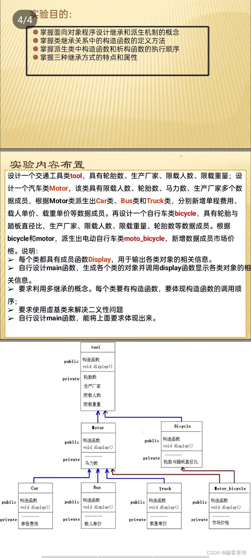 实验目的: 掌握面向对象程序设计继承和派生机制的概念 ! 掌握类继承关系中的构造函数的定义方法 ●掌 握派生类中构造函数和析构函数的执行顺序 掌握三种继承方式的特点和属性 实验内容布置 设计-一个交通工具类tool,具有轮胎数、生产厂家、限载人数、限载重量;设 计-一个汽车类Motor,该类具有限载人数、轮胎数、马力数、生产厂家多个数 据成员,根据Motor类派生出Car类、Bus类和Truck类, 分别新增单程费用、 载人单价、载重单价等数据成员。再设计-一个自行车类bicycle,具有轮胎与 踏板直径比,生产厂家、限载人数、限载重量、轮胎数等数据成员。根据 bicycle和motor,派生出电动自行车类moto. bicycle, 新增数据成员市场价 格。说明: 每个类都具有成员函数Display,用于输出各类对象的相关信息。 ➢自行设计main函数, 生成各个类的对象并调用display函数显示各类对象的相 关信息。 ➢要求利用多继承的概念。每个类要有构造函数,要体现构造函数的调用顺 序; 要求使用虚基类来解决二义性问题 ➢自行设计main函数,能将上面要求体现出来。