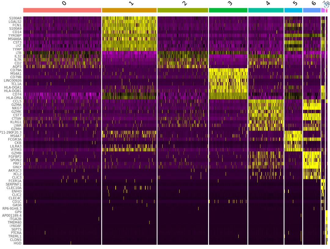 DoHeatmap()为给定的单元格和特征生成表达式热图。在本例中,我们将为每个聚类绘制前 20 个标记(如果少于 20 个,则绘制所有标记)。