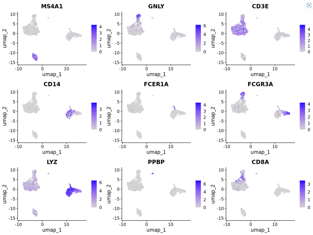 FeaturePlot(pbmc, features = c("MS4A1", "GNLY", "CD3E", "CD14", "FCER1A", "FCGR3A", "LYZ", "PPBP", "CD8A"))