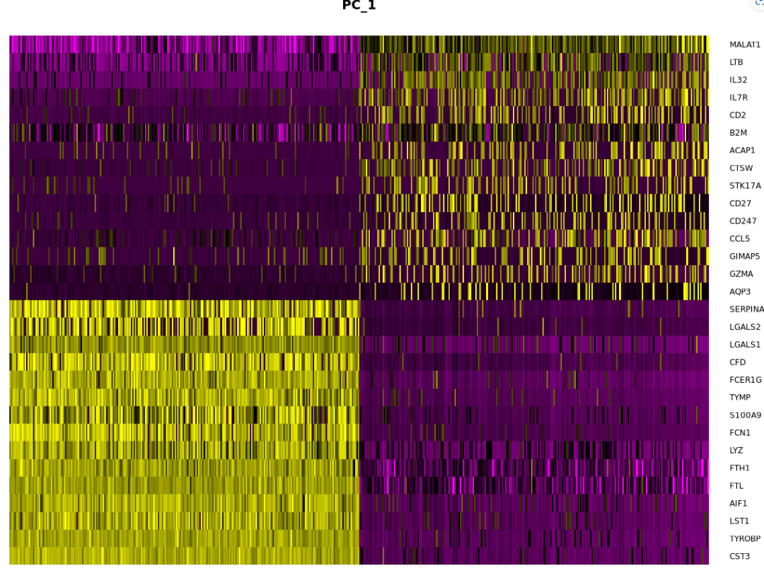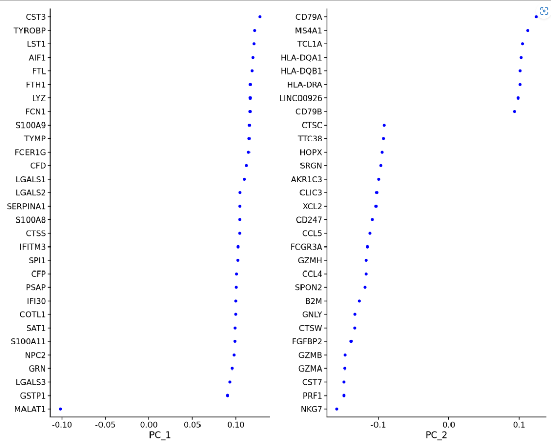 pbmc <- ScaleData(pbmc, features = all.genes)接下来,我们对缩放数据执行 PCA。默认情况下,只有先前确定的变量特征用作输入,但如果你想选择不同的子集,可以使用 argument 进行定义。featuresScaleData对于第一个主成分,Seurat 输出具有最多正负载和负负载的基因列表,代表数据集中单个细胞之间表现出相关性(或反相关性)的基因模块。