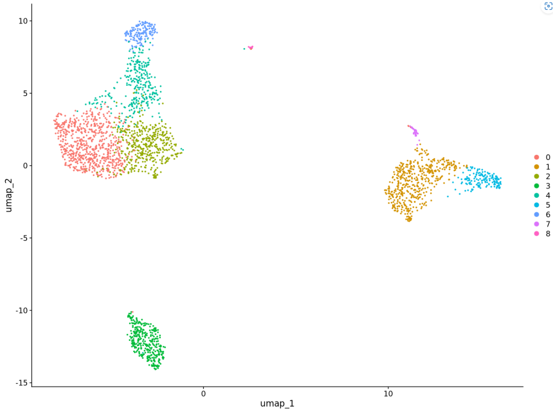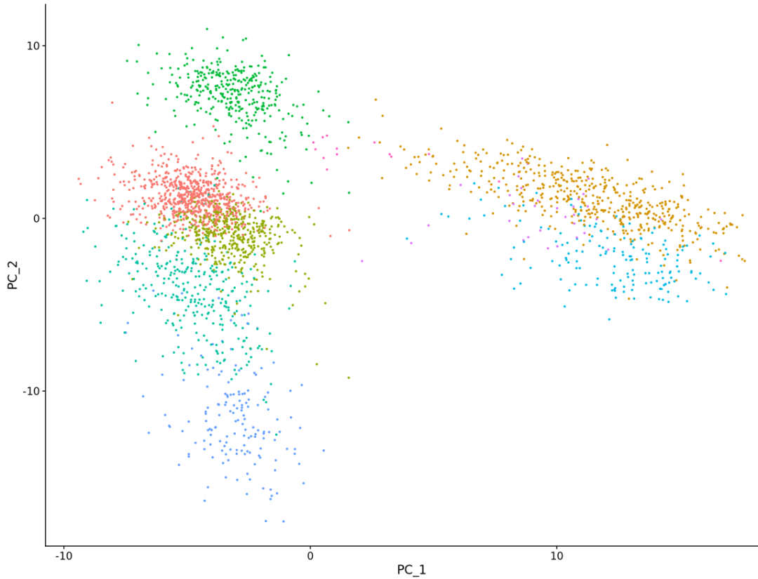 Seurat 应用了基于图形的聚类方法,以 (Macosko et al) 的初始策略为基础。驱动聚类分析的距离指标(基于以前确定的 PC)保持不变。
