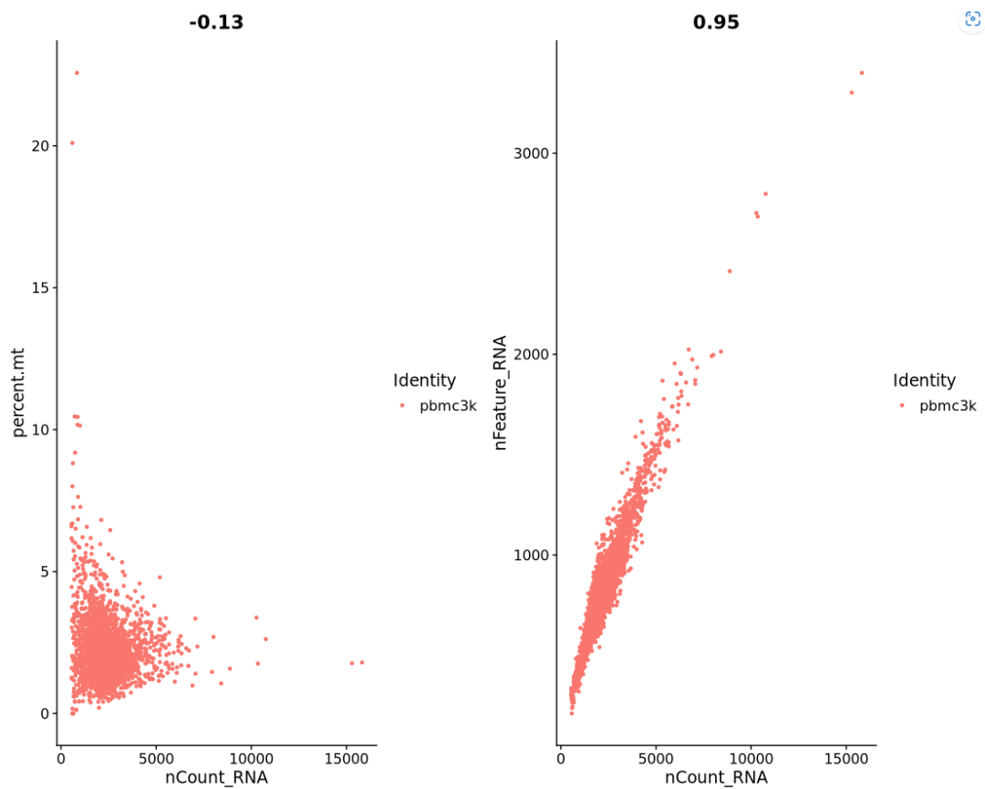 plot1 <- FeatureScatter(pbmc, feature1 = "nCount_RNA", feature2 = "nFeature_RNA")