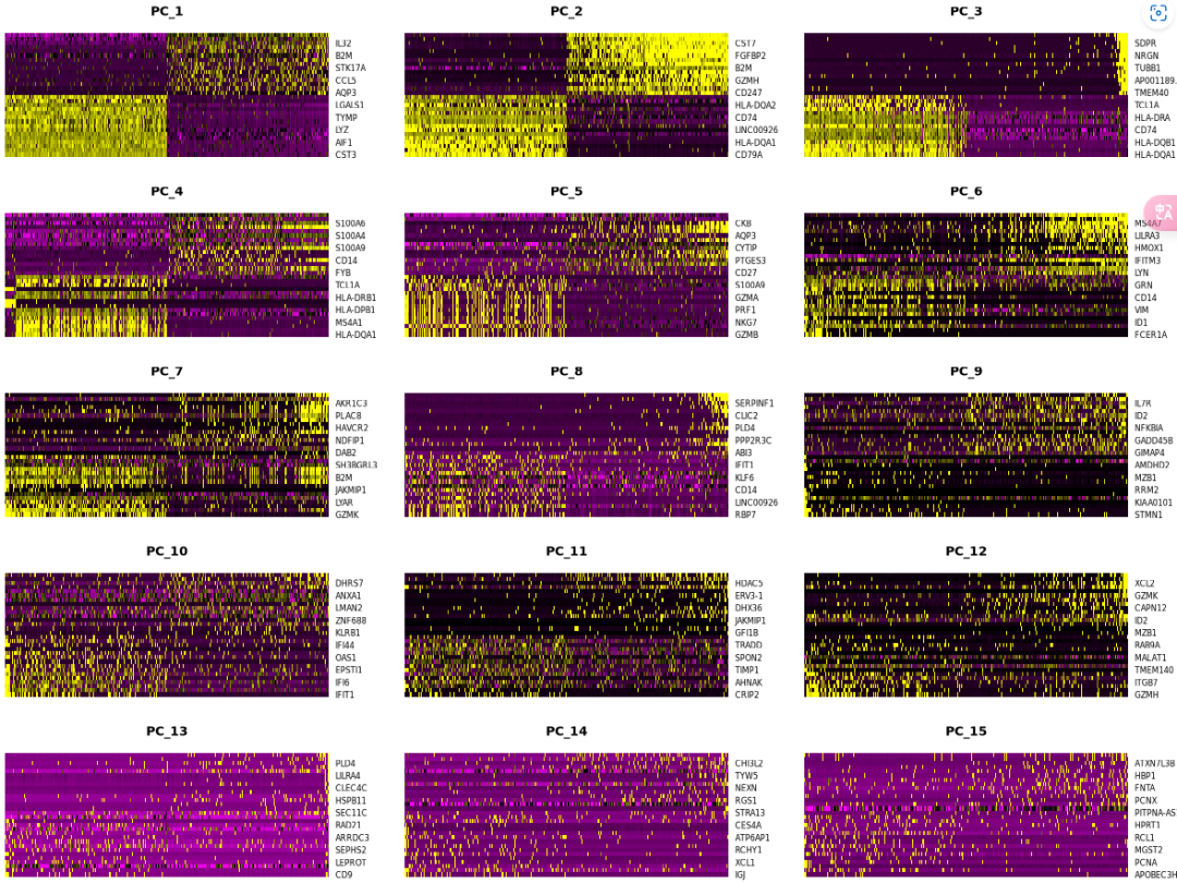 可以轻松探索数据集中异质性的主要来源,并且在尝试决定要包含哪些 PC 以进行进一步的下游分析时非常有用。像元和特征都根据其 PCA 分数进行排序。设置为数字会在频谱的两端绘制“极端”单元格,从而显著加快大型数据集的绘制速度。显然是一种监督分析,但我们发现这是探索相关特征集的宝贵工具。DimHeatmap()cells.