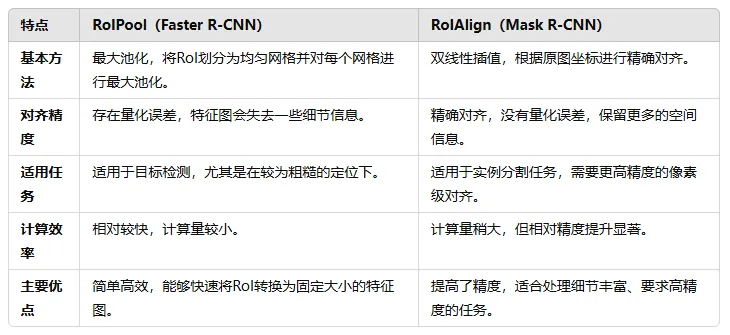 RoIAlign是对RoIPool的改进,使得模型能够在实例分割任务中获得更好的精度,避免了传统RoIPool带来的量化误差,能够更精确地保留物体的细节信息。