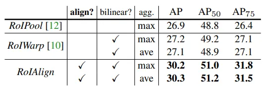 RoIAlign层将AP提高了3个百分点,将AP75提高了5个百分点。使用正确的对齐是导致RoI层之间差距较大的唯一因素。