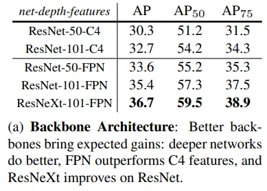更好的主干网络带来预期的收益:更深层的网络表现更好,FPN优于C4特征,ResNeXt在ResNet上有所改进。