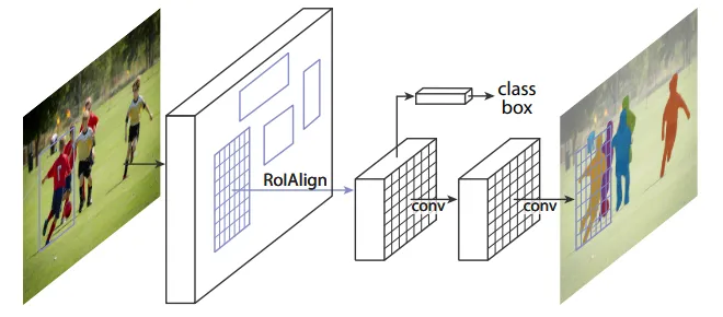 Mask R-CNN的基本思想是,在Faster R-CNN的基础上添加了一个新的分支,用于预测每个RoI(Region of Interest)区域内的物体分割掩码。