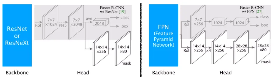 右图:当ResNet/ResNeXt与FPN一起使用时,网络直接分为两个头。一个头用于分类和边界框,一个头用于掩码。