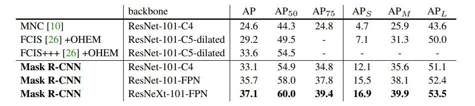 尝试了 3 个主干网络:ResNet、ResNeXt和FPN。