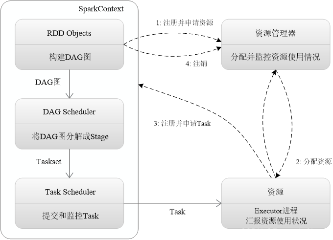 1、首先为应用构建起基本的运行环境,即由Driver创建一个SparkContext,进行资源的申请、任务的分配和监控。SparkContext对象代表了和一个集群的连接。 2、资源管理器为Executor分配资源,并启动Executor进程。 3、SparkContext根据RDD的依赖关系构建DAG图,DAG图提交给DAGScheduler解析成Stage,然后把一个个TaskSet提交给底层调度器TaskScheduler处理;Executor向SparkContext申请Task,Task Scheduler将Task发放给Executor运行,并提供应用程序代码。 4、Task在Executor上运行,把执行结果反馈给TaskScheduler,然后反馈给DAGScheduler,运行完毕后写入数据并释放所有资源 。