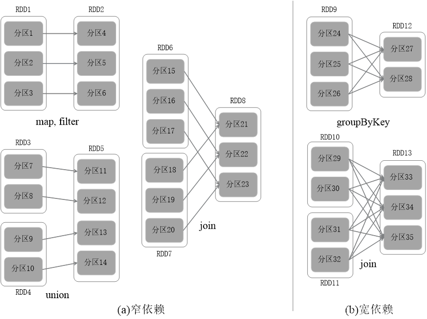 窄依赖表现为一个父RDD的分区对应于一个子RDD的分区或多个父RDD的分区对应于一个子RDD的分区;宽依赖则表现为存在一个父RDD的一个分区对应一个子RDD的多个分区。