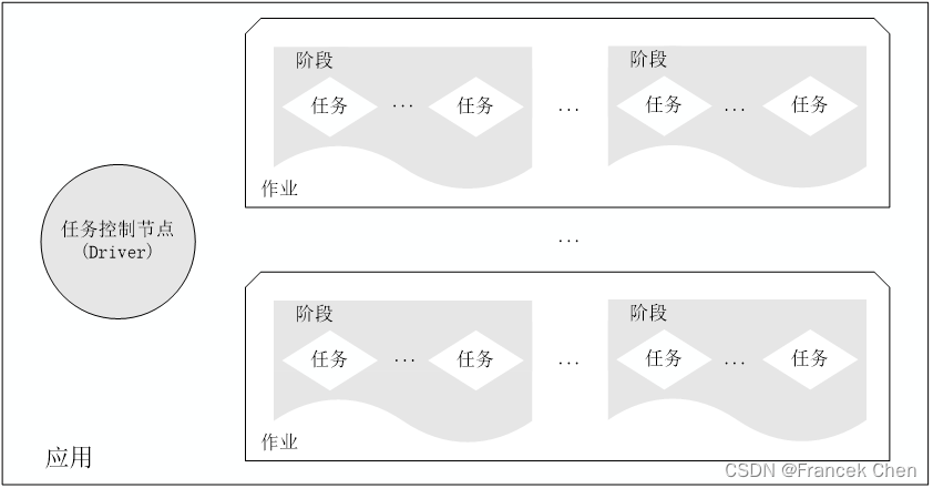 一个应用由一个Driver和若干个作业构成,一个作业由多个阶段构成,一个阶段由多个没有Shuffle关系的任务组成 当执行一个应用时,Driver会向集群管理器申请资源,启动Executor,并向Executor发送应用程序代码和文件,然后在Executor上执行任务,运行结束后,执行结果会返回给Driver,或者写到HDFS或者其他数据库中。