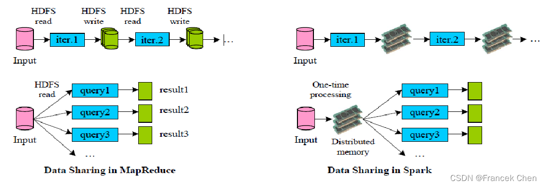 Spark有着自己的生态系统,但同时兼容HDFS、Hive等分布式存储系统,可以完美融入Hadoop的生态圈中,代替MapReduce去执行更高的分布式计算。两者区别如图所示,基于MapReduce的计算引擎通常会将中间结果输出到磁盘上进行存储和容错;而Spark则是将中间结果尽量保存在内存中以减少底层存储系统的I/O,以提高计算速度。