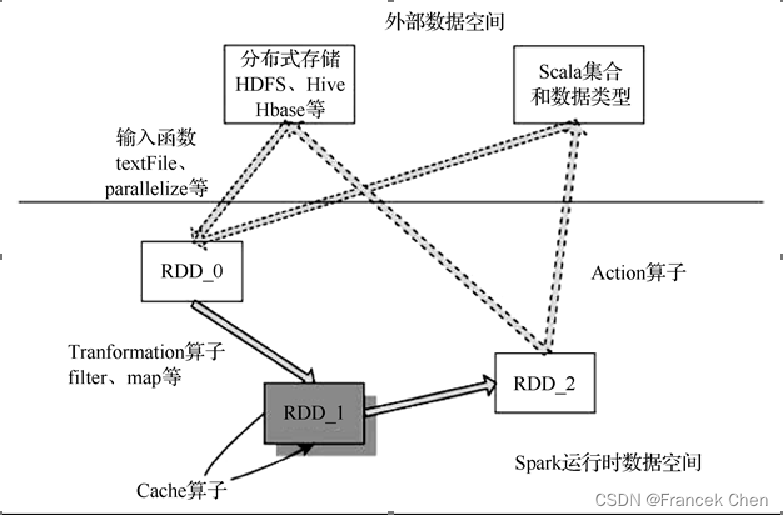 Spark将数据抽象成弹性分布式数据集(Resilient Distributed Dataset,RDD),RDD实际是分布在集群多个节点上数据的集合,通过操作RDD对象来并行化操作集群上的分布式数据。