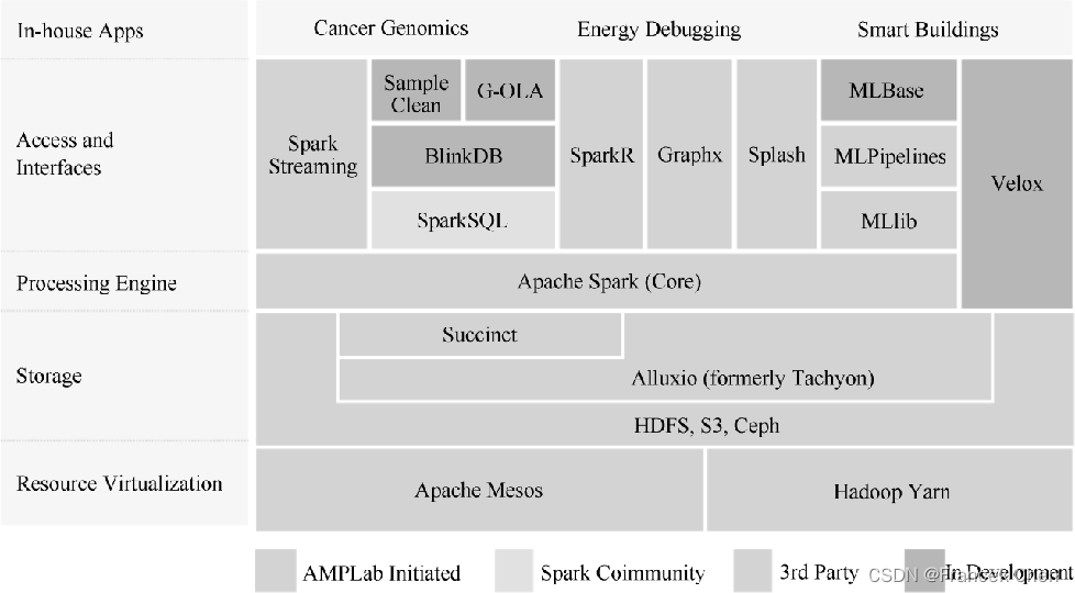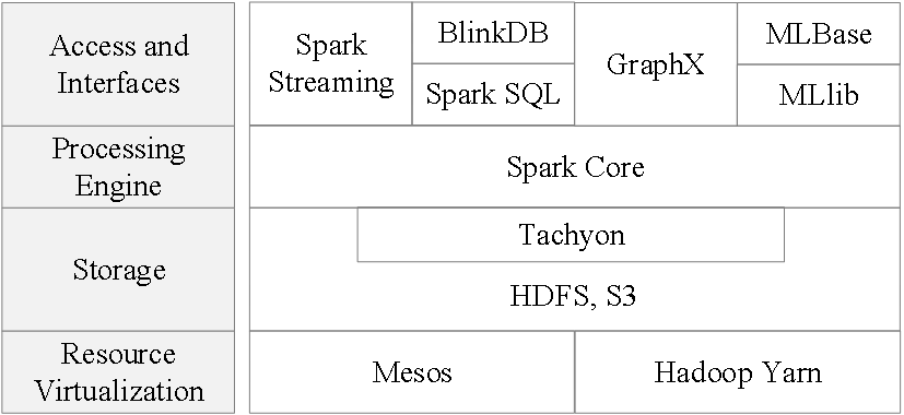 Spark的设计遵循“一个软件栈满足不同应用场景”的理念,逐渐形成了一套完整的生态系统,既能够提供内存计算框架,也可以支持SQL即席查询、实时流式计算、机器学习和图计算等。Spark可以部署在资源管理器YARN之上,提供一站式的大数据解决方案。因此,Spark所提供的生态系统足以应对上述三种场景,即同时支持批处理、交互式查询和流数据处理。 现在,Spark生态系统已经成为伯克利数据分析软件栈BDAS(Berkeley Data Analytics Stack)的重要组成部分。
