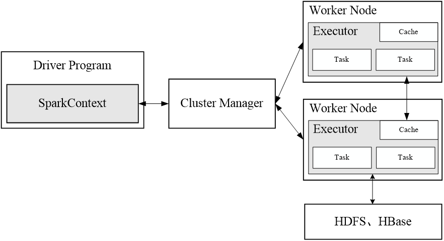 Spark运行架构包括集群资源管理器(Cluster Manager)、运行作业任务的工作节点(Worker Node)、每个应用的任务控制节点(Driver)和每个工作节点上负责具体任务的执行进程(Executor) 资源管理器可以自带或Mesos或YARN。