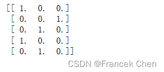 运行上述代码,将得到一个独热编码后的数组,表示每个颜色的二进制特征表示。注意,fit_transform()方法同时执行了学习和转换步骤。