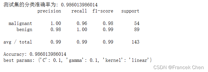 print("测试集的分类准确率为:",lgr.score(X_test,y_test))(2)SVM算法模型性能评估: