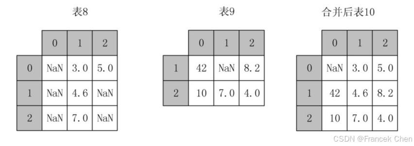 数据分析和处理过程中偶尔会出现两份数据的内容几乎一致的情况,但是某些属性在其中一张表上是完整的,而在另外一张表上的数据则是缺失的。这时除了使用将数据一对一比较,然后进行填充的方法外,还有一种方法就是重叠合并。