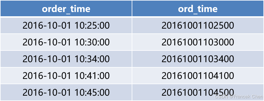如表所示,订单系统的时间字段order_time与结算系统的时间字段ord_time采用了不同的格式导致时间格式不一致。