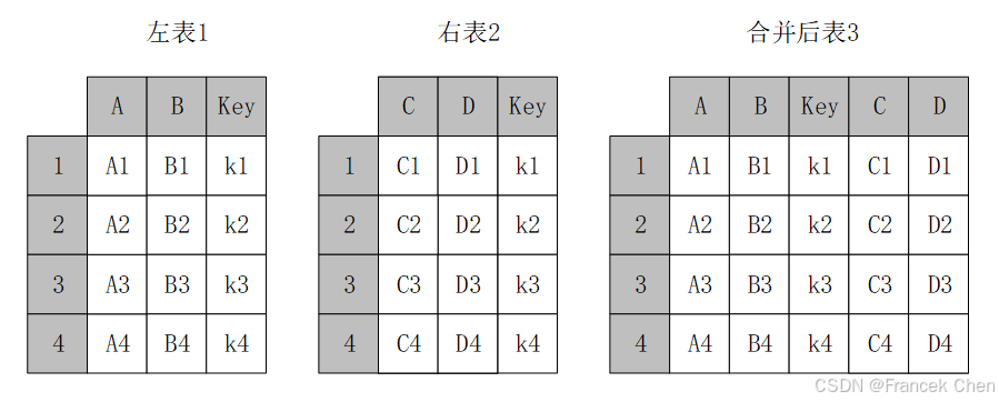 主键合并即一个或多个键将两个数据集的行连接起来,如果两张包含不同字段的表含有同一个主键,那么可以根据相同的主键将两张表拼接起来,结果集列数为两张标的列数和减去连接键的数量,如图所示。