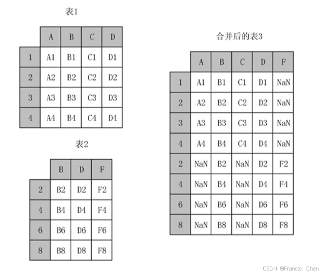 当需要合并的表索引或列名不完全一样时,可以使用join参数选择是内连接还是外连接,在内连接的情况下,仅仅返回索引或列名的重叠部分;在外连接的情况下,则显示索引或列名的并集部分数据,不足的地方则使用空值填补。当需要合并的表含有的主键或列名完全一样时,不论join参数取值是inner或者outer,结果都是将表格完全按照X轴或Y轴拼接起来。