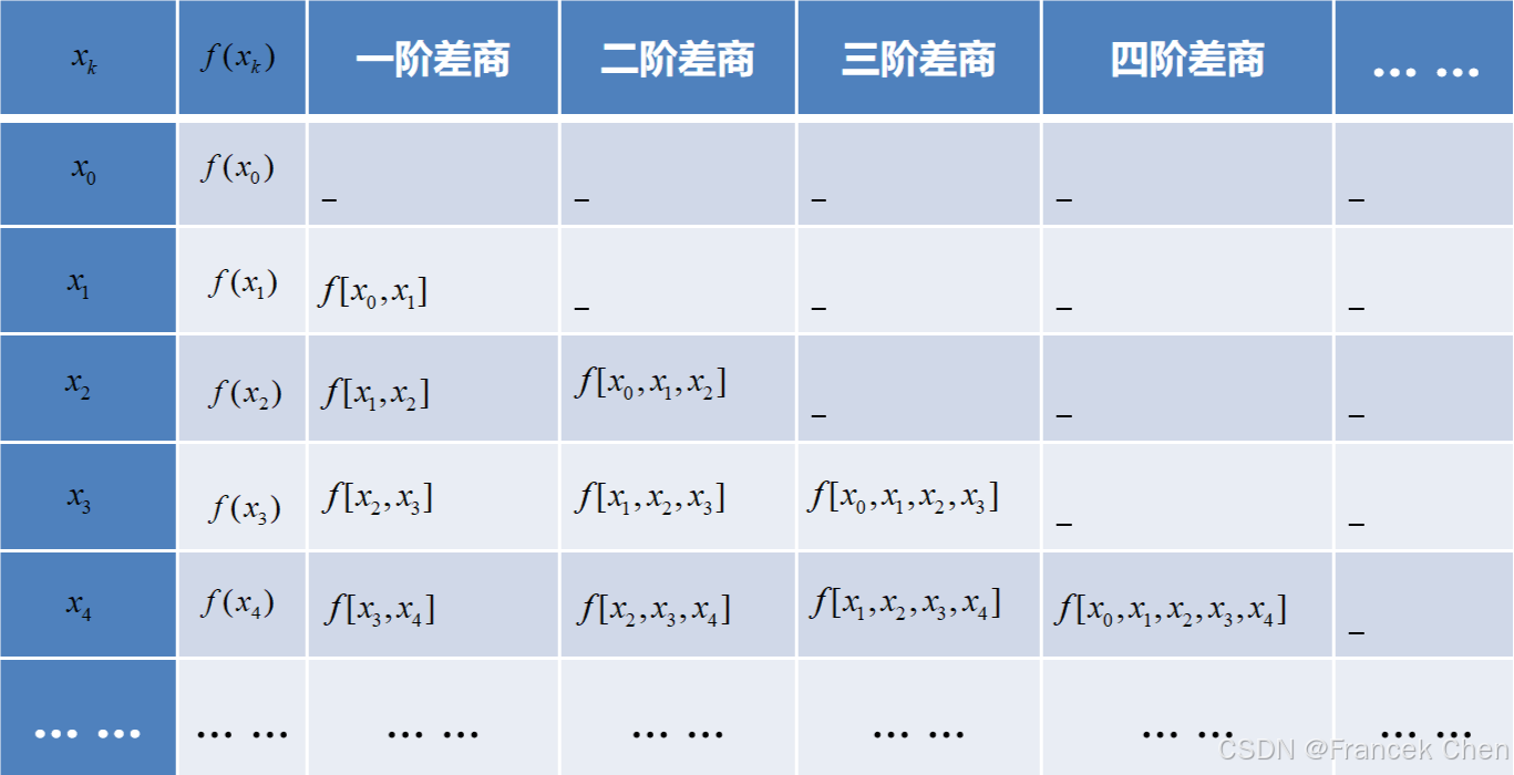 借助差商的定义,牛顿插值多项式可以表示为如下。