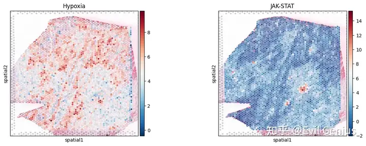 sc.pl.spatial(acts_progeny, color=['Hypoxia', 'JAK-STAT'], cmap='RdBu_r', size=1.3)