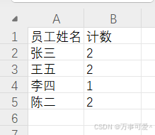 进入你会发现,里面有两列,一列为员工姓名列,一列为计数,需要求和的话可以再次利用sumif函数进行求和,这里不过多赘述,当然还可以利用高级筛选和函数去完成以上操作,这只是其中较为简单的一种方法,其他的方法如果比较感兴趣可以评论区留言探讨。
