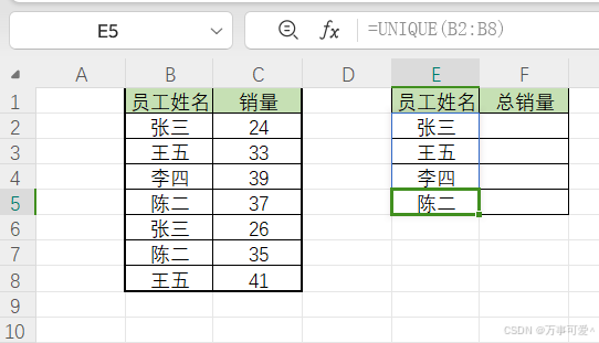 在E2单元格输入=unique(B2:B8),计算B2:B8范围内的一系列唯一值。