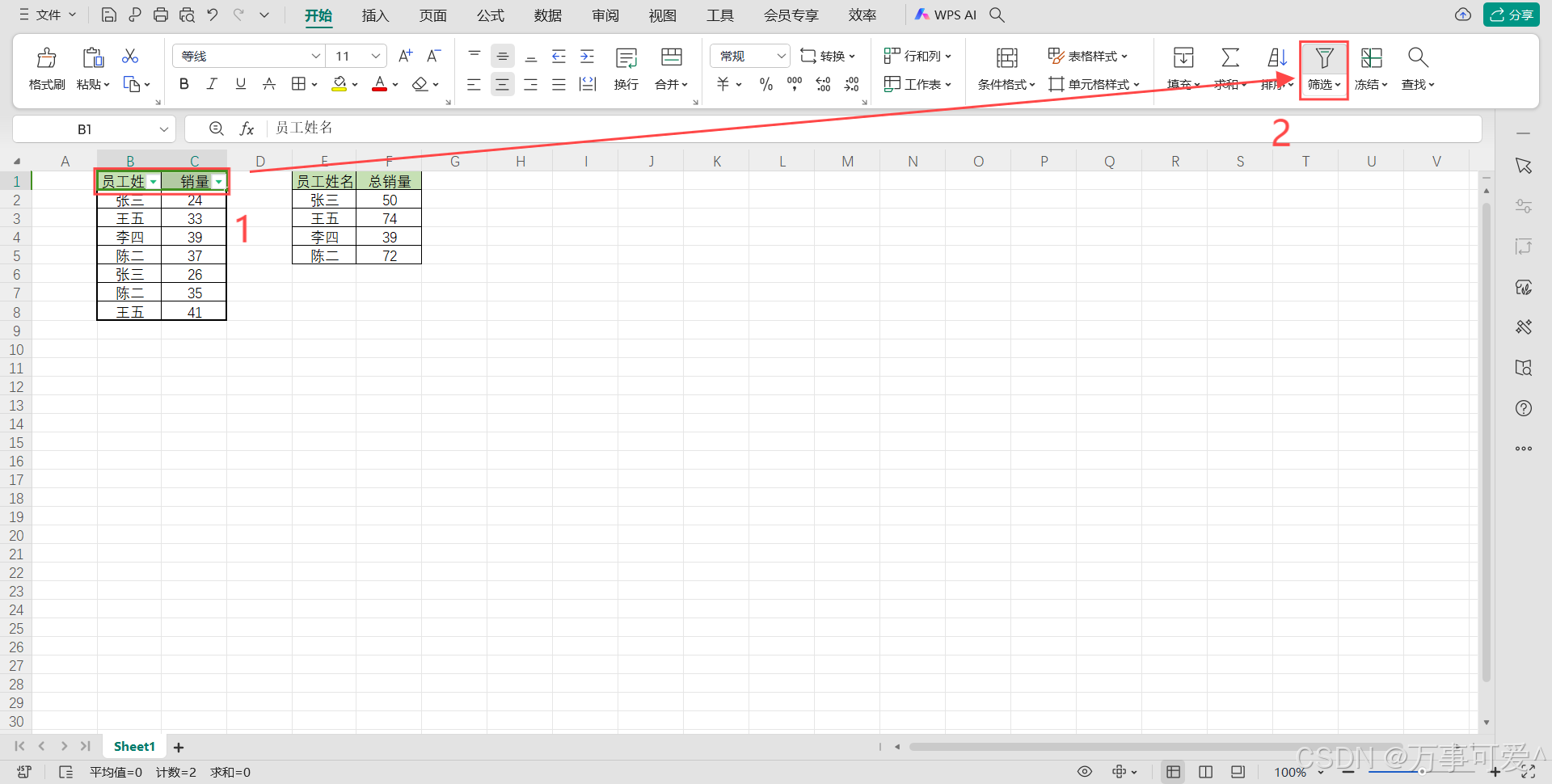 第一步:先对员工姓名列打上筛选标,如下图所示,先选中B:C单元格区域,再点击筛选,那么员工姓名和销量字段将会出现筛选标。