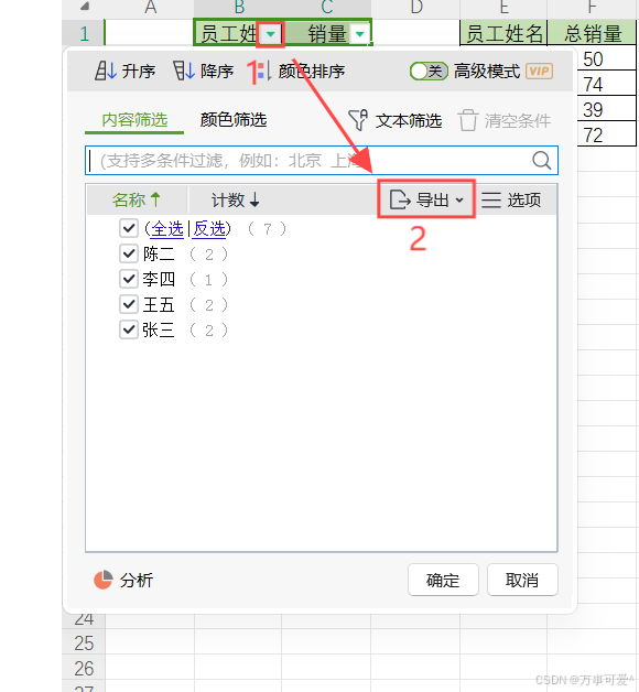 点击筛选标,点击导出,在点击导出结果至新工作表。