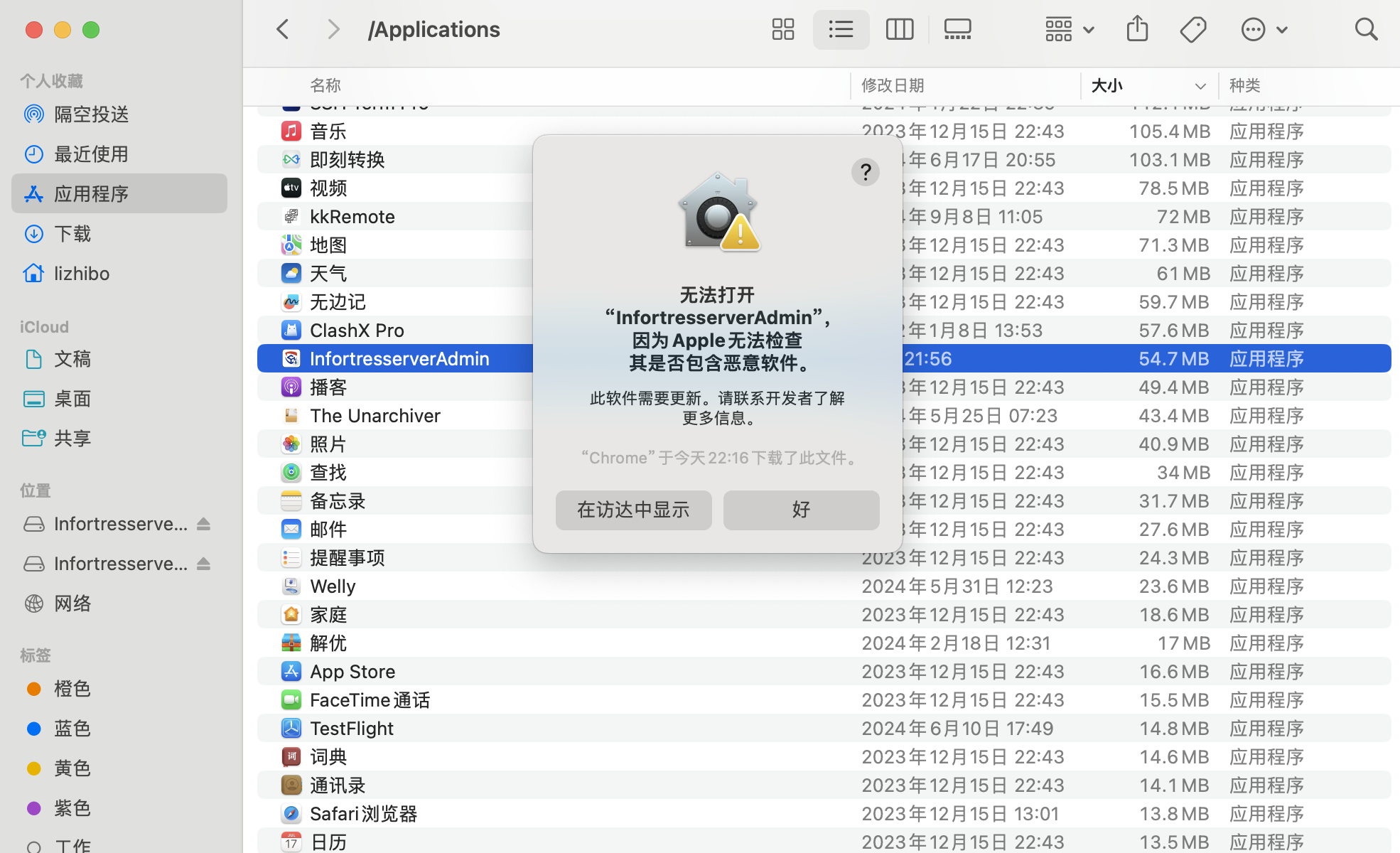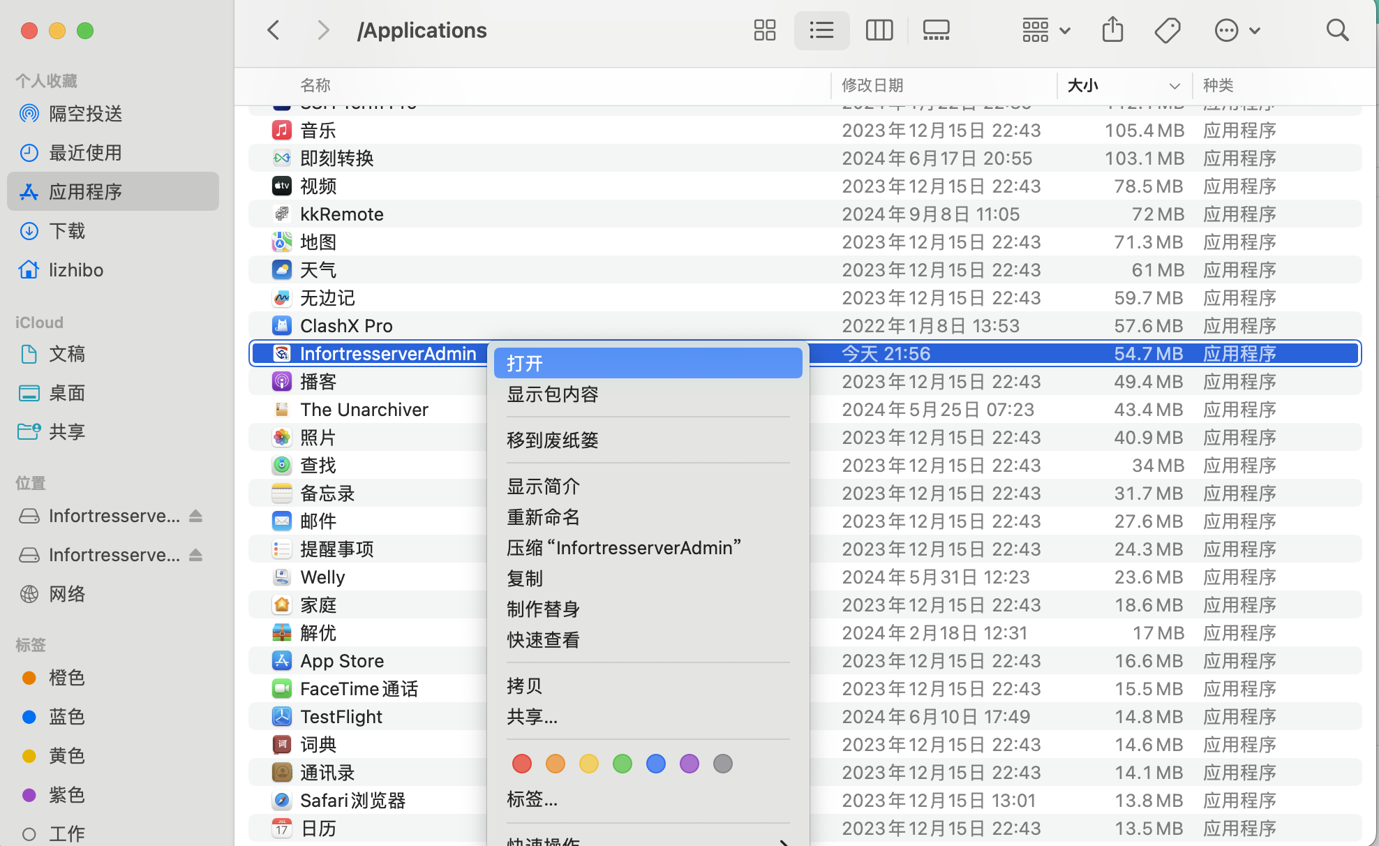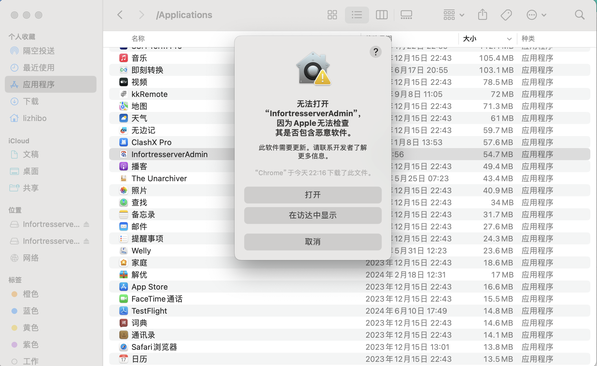然后右键点击 InfortresserverAdmin,在弹出的菜单中选择“打开”。在随后显示的提示对话框中继续选择“打开”。