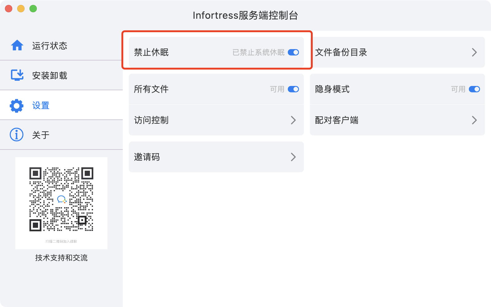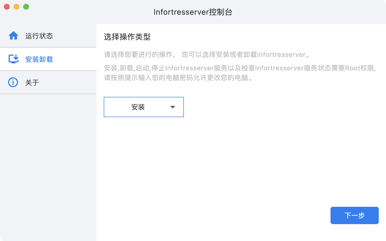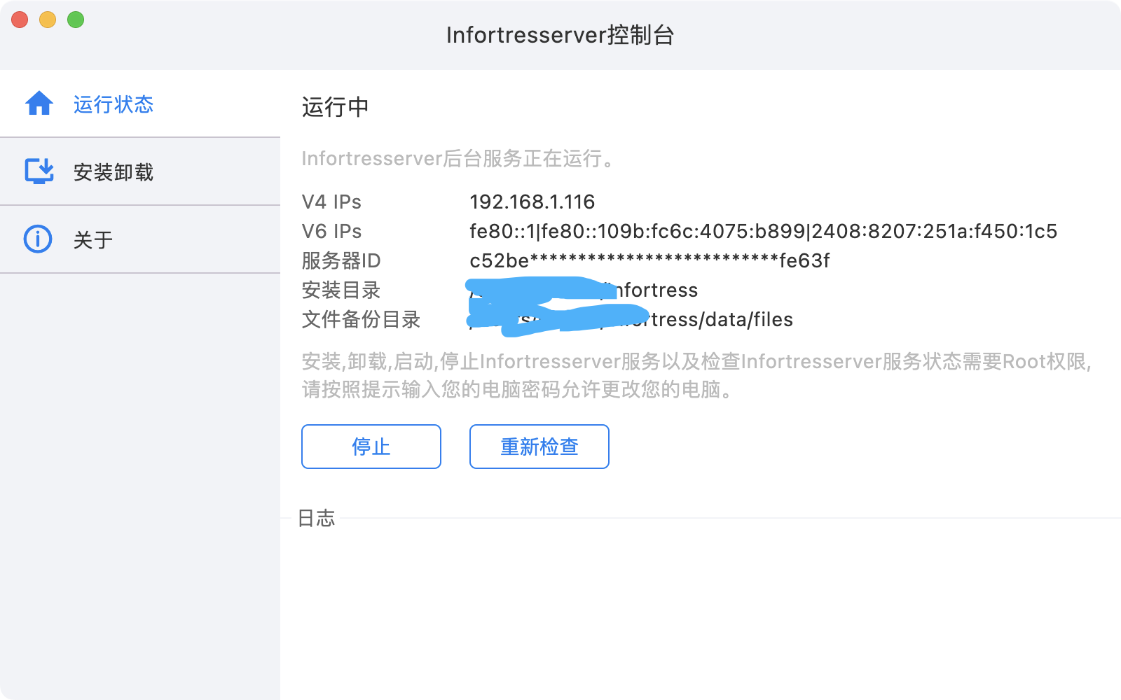 请不要将infortresserver安装到“桌面”、“下载”和“文稿“目录。如果在这几个目录运行infortresserver后台服务,需要额外的权限配置。请参考苹果公司官方文档在 Mac 上控制对文件和文件夹的访问。 请谨慎选择合适的文件备份目录确保有足够的磁盘空间。