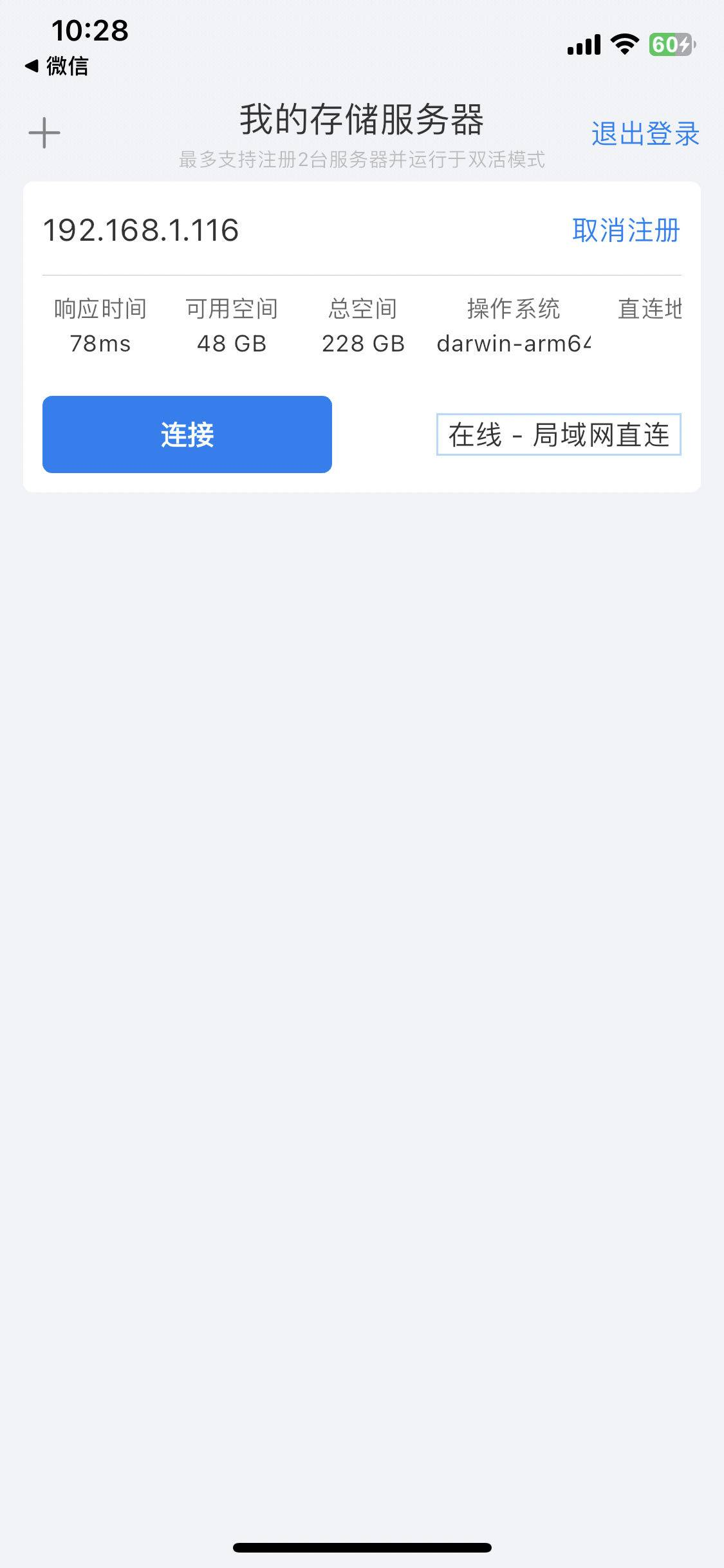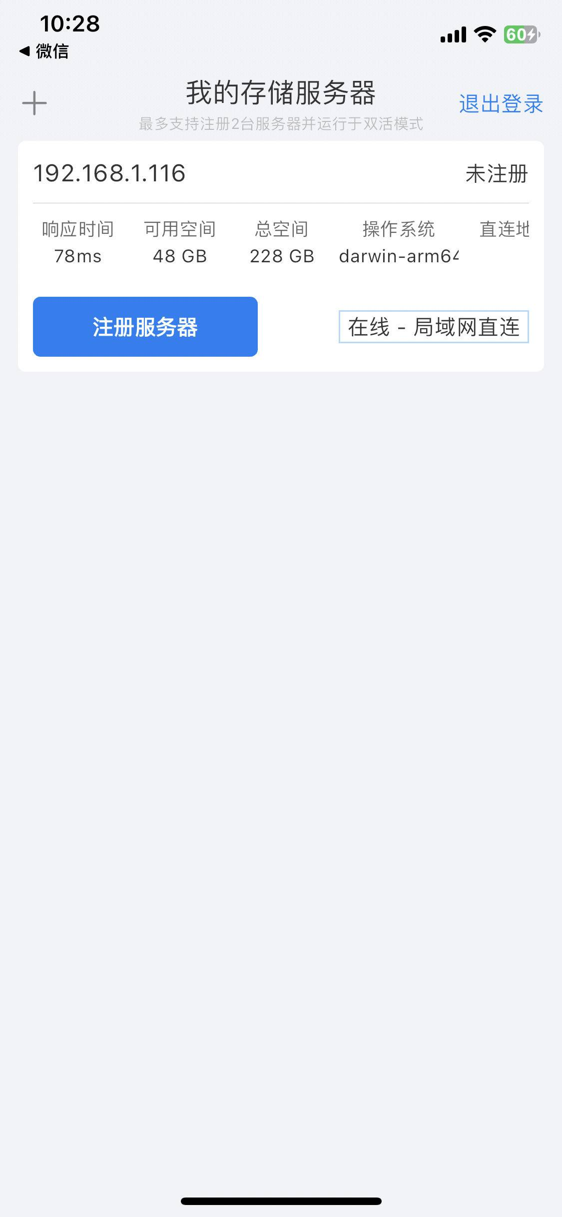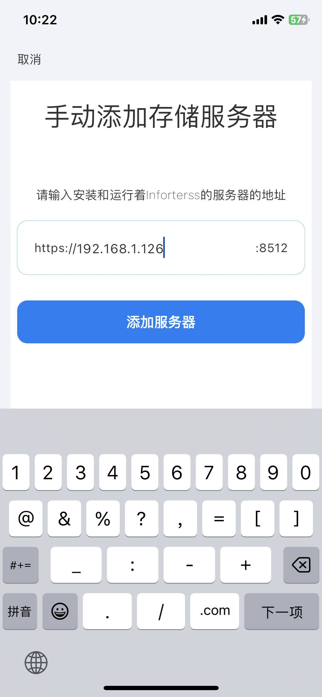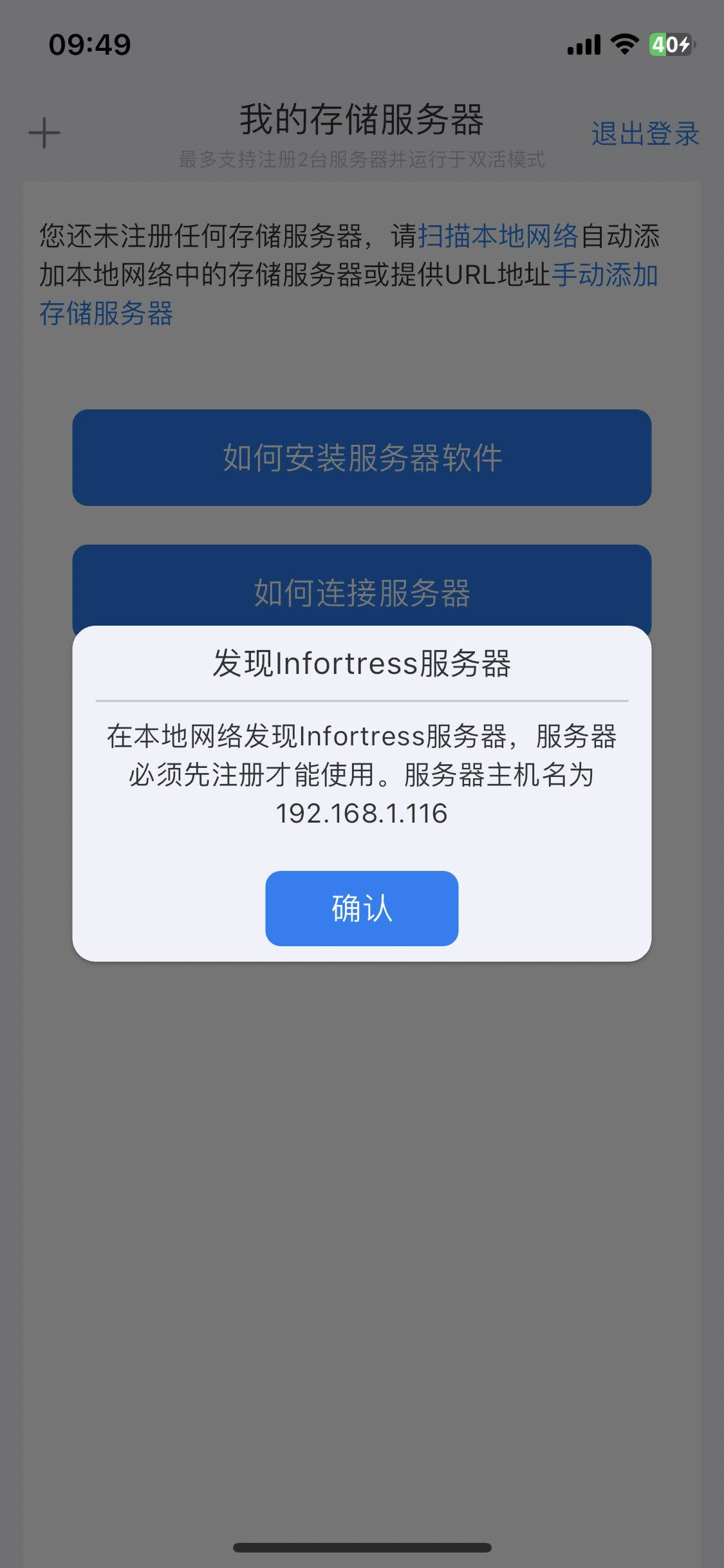 如果服务器和打开App的手机同时处于同一个WIFI网络,进入“我的存储服务器”页面之后,会自动发现同一个WIFI网络中的Infortress服务器。点击确认之后会将其加入“我的存储服务器”列表。如果您先打开的客户端App,后搭建好的存储服务器,那么您下拉这个页面会重新自动发现新搭建好的存储服务器。