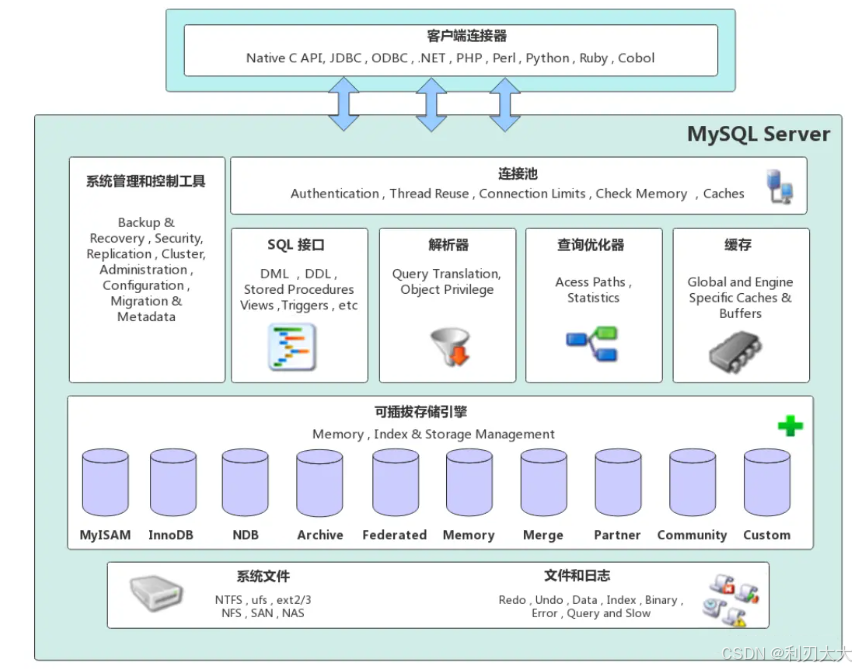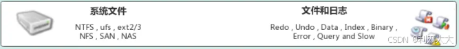 系统文件存储层主要是 负责将数据库的数据和日志存储在系统的文件中,同时完成与存储引擎的之间的打交道,是文件的物理存储层。其存储的文件主要有:日志文件、数据文件、配置文件、MySQL