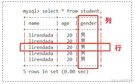 mysql> insert into student (name, age, gender) values ('lirendada', 20, '男');