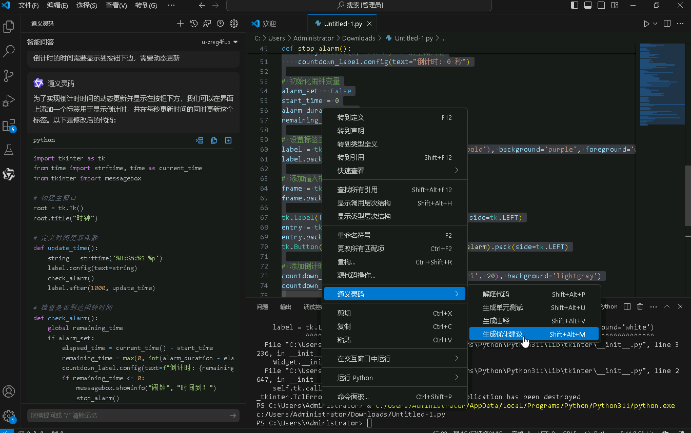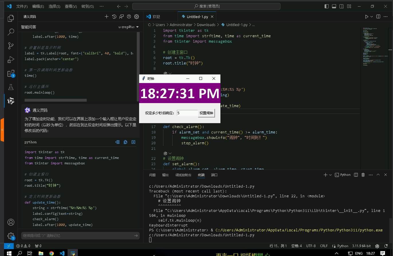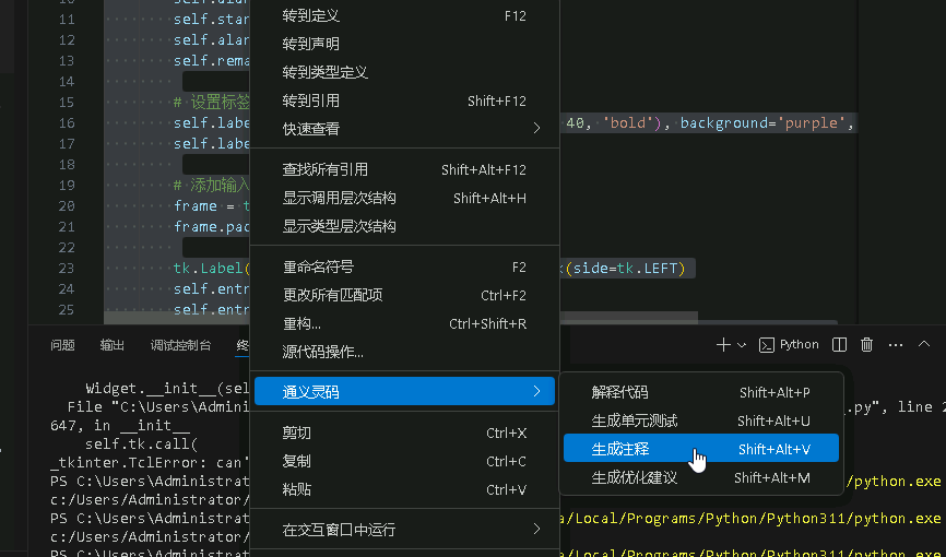 异常处理不够完善:虽然 set_alarm 函数中有异常处理,但其他地方(如 check_alarm)没有处理可能的异常情况,比如 messagebox.showinfo 可能会抛出异常。
