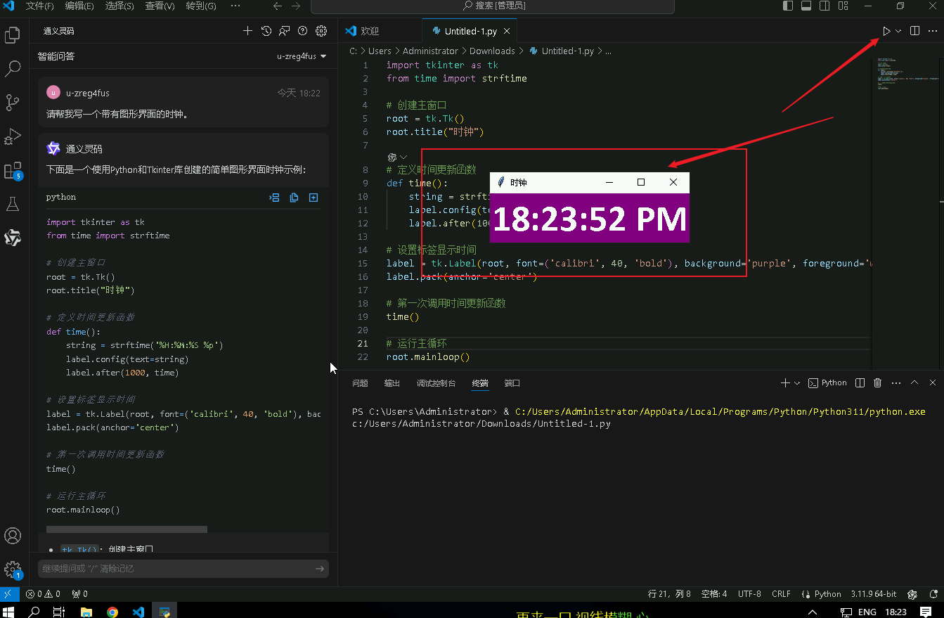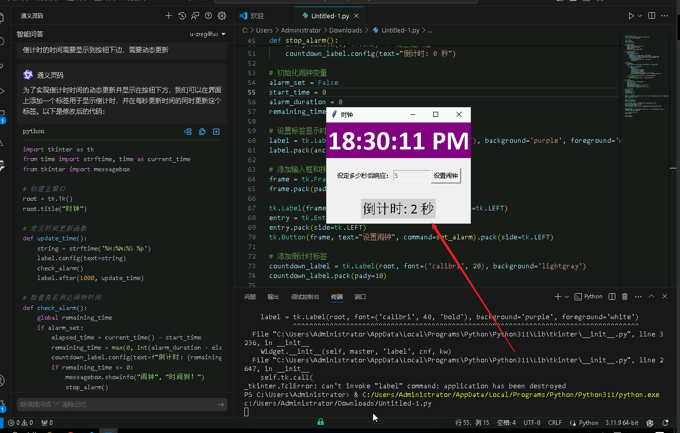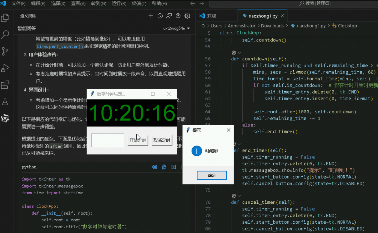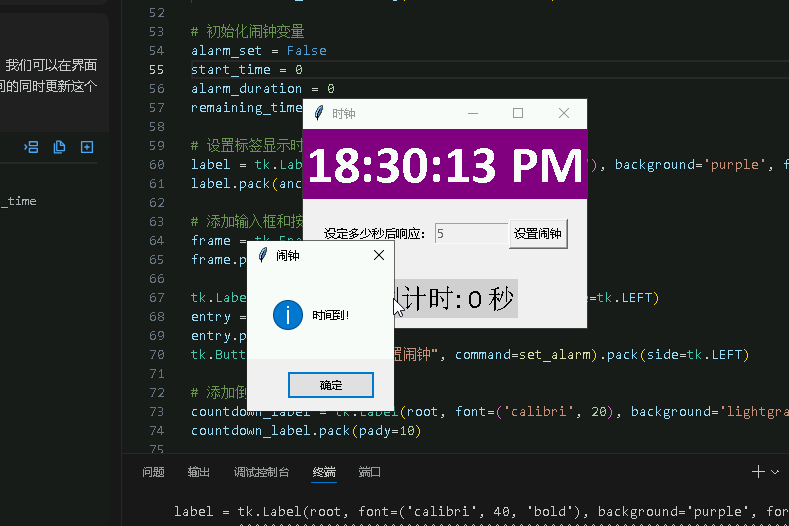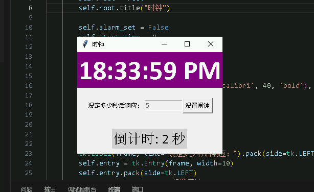 ClockApp 类是一个简单的时钟应用程序,使用 Tkinter 构建,可以设置一个倒计时闹钟。