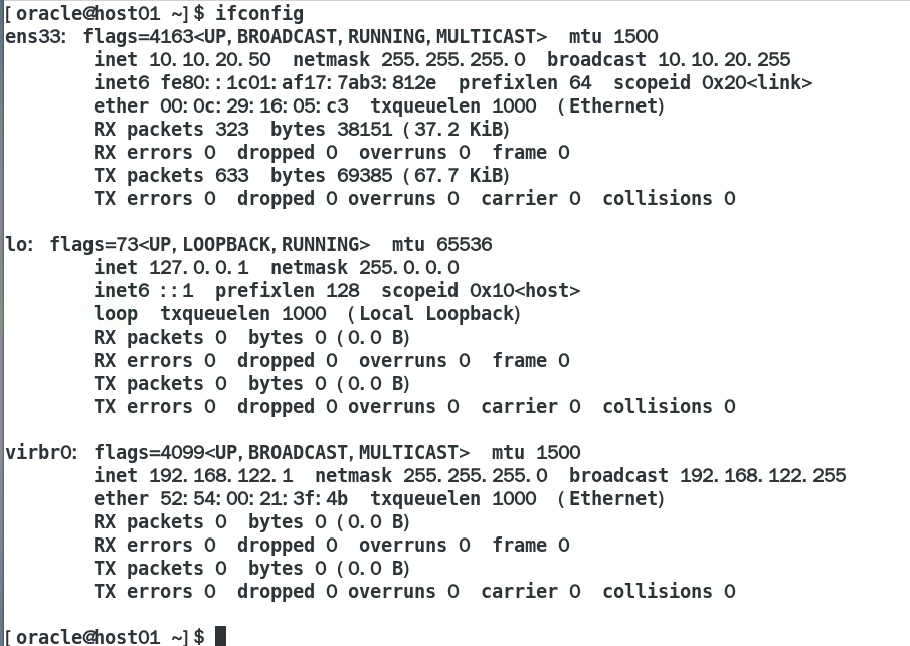 - 输入hostname和ifconfig,验证系统信息, 注意主机名是host01.example.com。