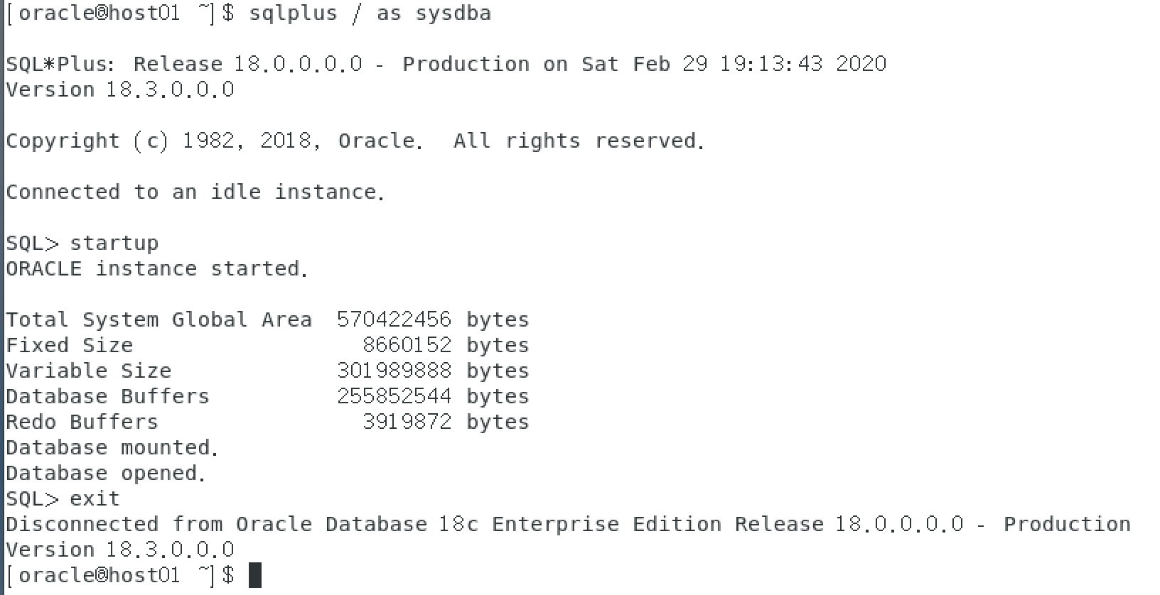 按照以下截屏命令启动数据库服务(其中startup和exit为SQL*Plus命令,需要手工输入),注意最后的输出为Database Opened,表示数据库正常打开,如果没有显示此信息,可能是虚拟机文件下载不全或文件损坏,学员应尽快与教务或者讲师联系。 输入exit退出SQL*plus命令行工具。