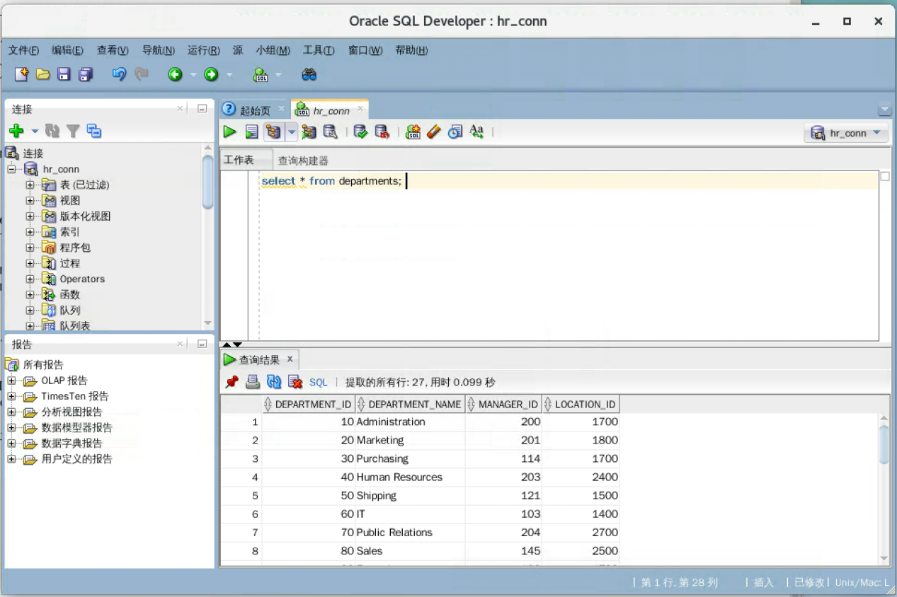 - 在SQL命令行窗口输入以下命令select * from departments; ,点击功能键的绿色三角图标,运行此命令,如果看到下方输出结果, 恭喜你! Oracle上机环境到此配置成功。